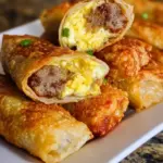 Delicious breakfast egg rolls filled with fluffy eggs, savory sausage, gooey cheese, and crispy hash browns, perfect for a cozy morning or brunch gathering.