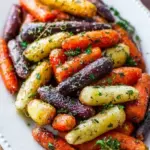 A vibrant side dish featuring rainbow carrots roasted to perfection with fresh herbs, delivering a delightful balance of flavor and texture.