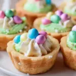 Delightful cookie cups filled with frosting and topped with colorful candies, perfect for Easter celebrations.