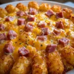 A warm and hearty dish combining savory ham, crispy tater tots, and gooey cheddar cheese, perfect for any occasion.