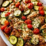 A warm and comforting bake featuring tender chicken, fresh zucchini, and juicy cherry tomatoes, topped with creamy feta cheese.