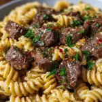 As you dive in, the first taste hits you with a delightful contrast of textures: the creamy sauce coats the pasta with a velvety smoothness, harmonizing wonderfully with tender, juicy pieces of steak. A hint of spice from the crushed red pepper flakes sneaks in to playfully dance on your palate, awakening your taste buds and inviting a satisfying warmth that lingers. This one-pot meal transcends the mundane; it brings together simple ingredients and transforms them into something that feels special, perfect for an intimate dinner or a quick weeknight delight that still impresses.