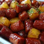 The beauty of this dish lies in its ease of preparation and stunning results. With minimal effort, you can impress your guests and create a memorable dish that lingers in their taste memories long after the party has ended. The tender sausages offer a mouthwatering texture that contrasts brilliantly with the juicy pineapple, while the sauce transforms them into an irresistible treat. Once you try these delightful bites, they will likely become your go-to recipe for any occasion.