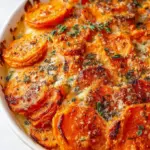A rich and creamy dish of layered sweet potatoes, enhanced with garlic, herbs, and a golden crust of Parmesan cheese. Perfect for any occasion.