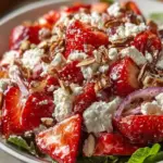 A vibrant salad featuring juicy strawberries, crunchy almonds, and creamy feta, drizzled with balsamic vinaigrette.